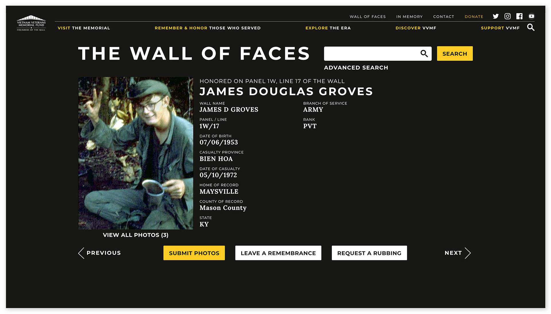 Based on the research that revealed user’s strong preference for buttons, I went against the general practice of limiting use of buttons to key tasks and desired actions. Instead, I embraced a host of buttons and, at VVMF’s request, even had the developers build in shortcode so that VVMF admins can add their own buttons directly in the WordPress WYSIWYG editor. I was especially conscious of the need for buttons on the very popular Wall of Faces portion of the website (individual Wall of Faces profile shown below). Rather than making only the action we wanted users to take (submitting photos) a button, I made all 3 actions buttons but emphasized the desired action with color.