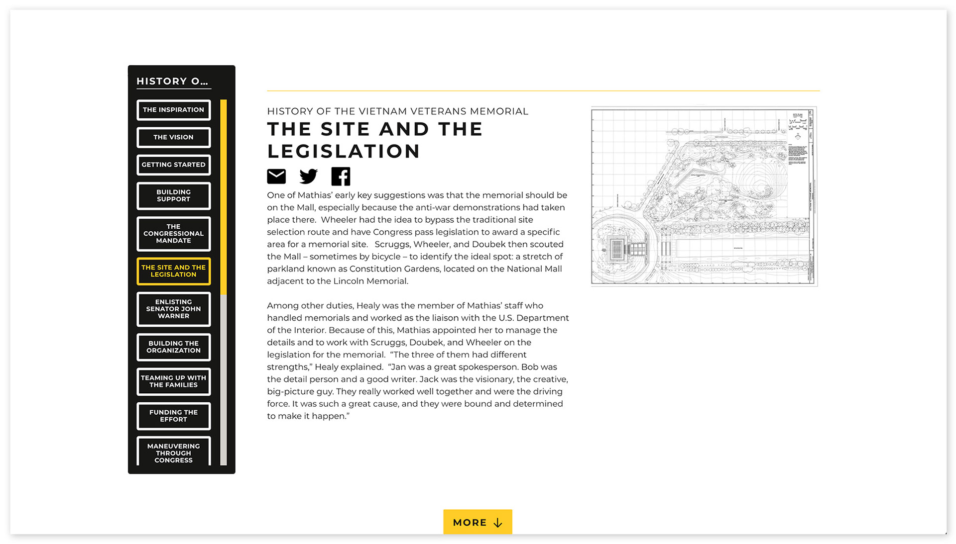 My research revealed that VVMF’s core user group, Vietnam Veterans and their families, has a few unique attributes. To increase usability for this key group, I incorporated several design elements to meet the needs that my research identified. During discussions, VVMF expressed a desire to present long-form content in an easily navigable format, so I created pages with side navigation that lets users jump to areas of content and doubles as a content outline. The project had a tight timeline, but by maintaining focus on the core goals and working efficiently we delivered the site ahead of schedule, while factoring in the needs of key users and VVMF.